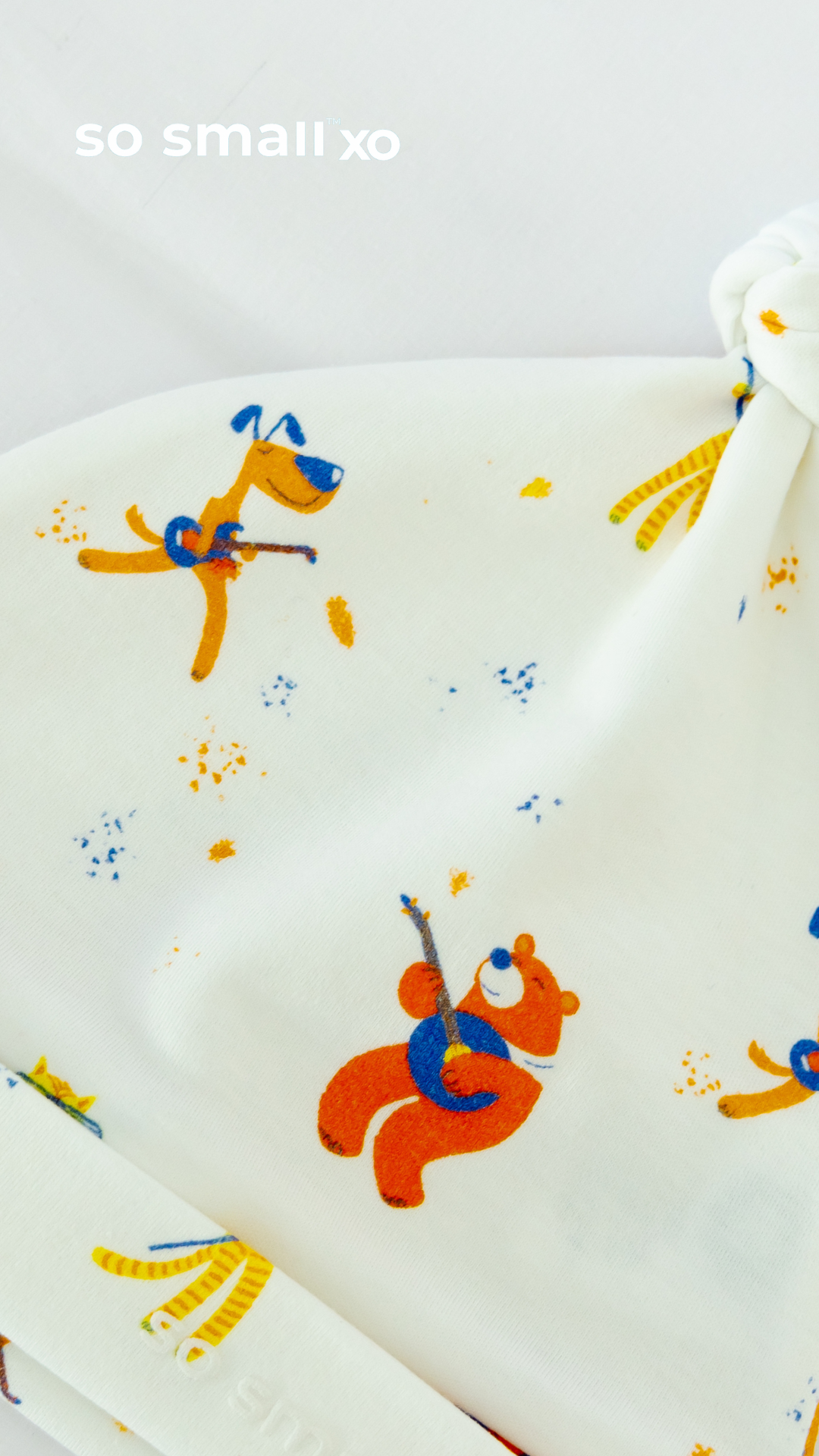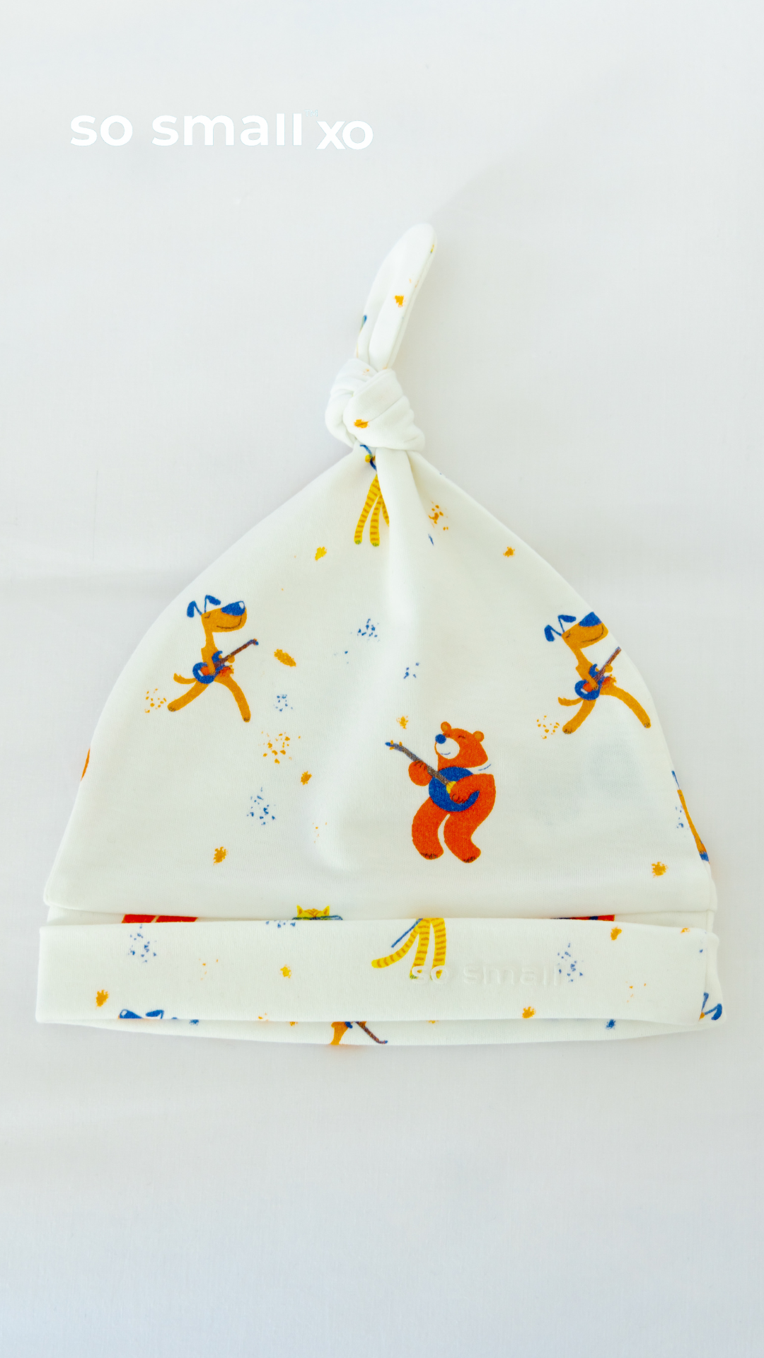 Our so small xo knotted beanie is crafted from Extra Fine 100% Egyptian Cotton, known for its remarkable breathability and silky touch on delicate newborn skin.